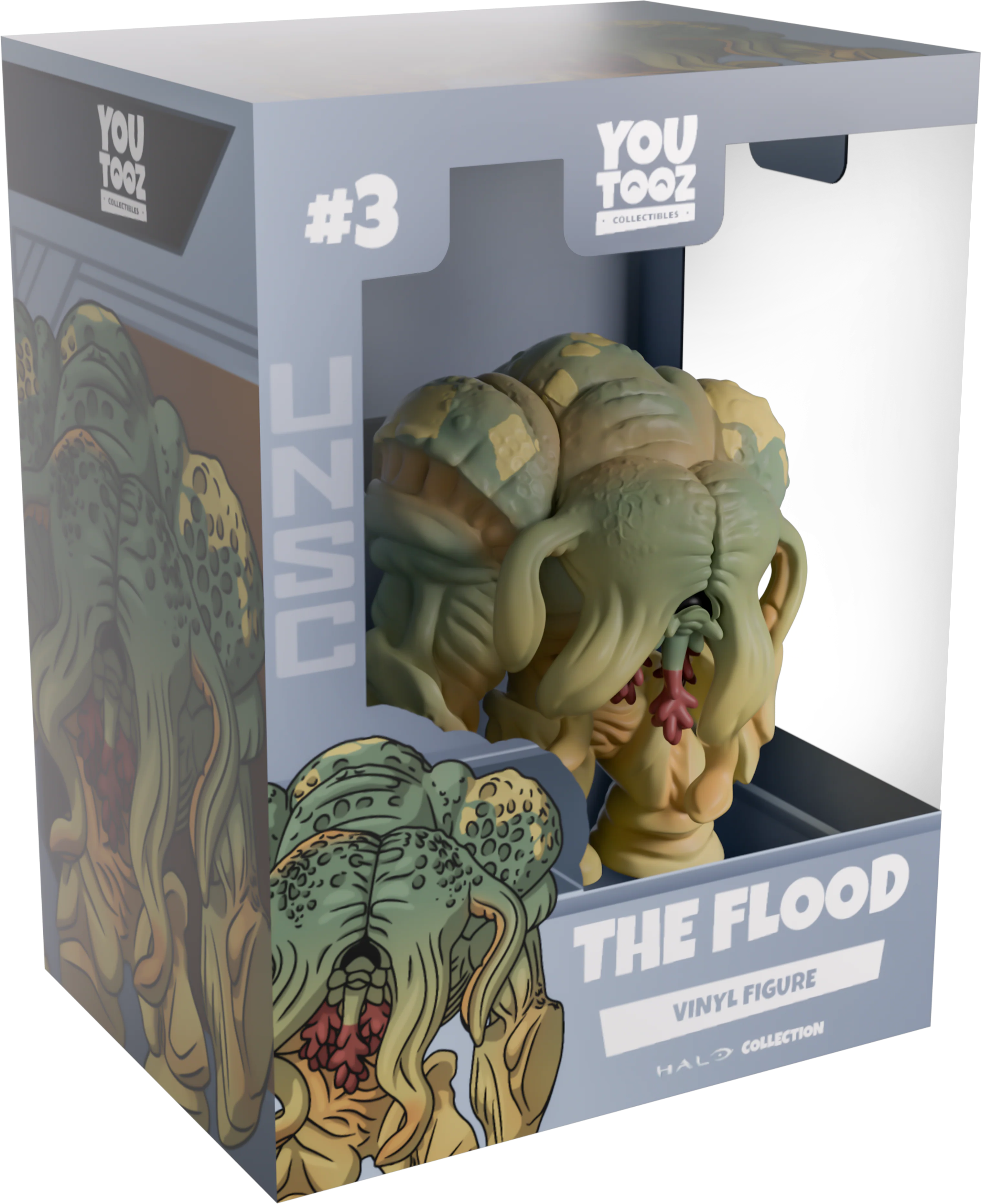 If it only takes a single Flood spore to destroy a species, then surely Youtooz is doomed! Shambling forward and hunching down at 4.4 inches tall with thick tendrils falling down either side of a deep red "mouth" that’s ready to spew out an explosion of Infected Form flood, the hulking shoulders of their mold green and yellow body stick out to the sides as the claws of a long right arm drag on the ground next to their thick trunks of legs. The exterior of their packaging sees The Flood looming down the end of a deep brown tunnel, while the light grey interior is covered in angled patterns which extend onto the protective sleeve with the UNSC logo as their figure can be seen through the large clear window at the packaging’s front. This collectible ships in a matte, embossed, protective outer sleeve and a custom sized plastic protector for maximum protection during shipping.