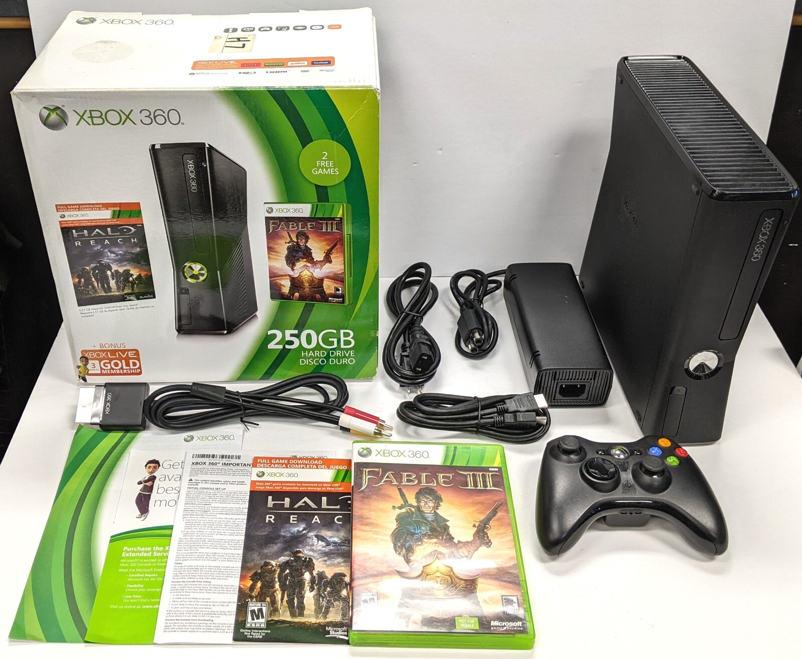 The Xbox 360 version of Halo Reach has specific technical specifications. The game is built for the Xbox 360 hardware, which includes a 3.2 GHz Triple Core IBM PowerPC processor, 512 MB of GDDR3 RAM, and an ATI Xbox 360 GPU with 10 MB of video memory. It also features a 250 GB hard drive and built-in Wi-Fi. The console comes with two custom-designed Halo Reach wireless controllers. The game renders at 1152x720 resolution and targets 30fps.